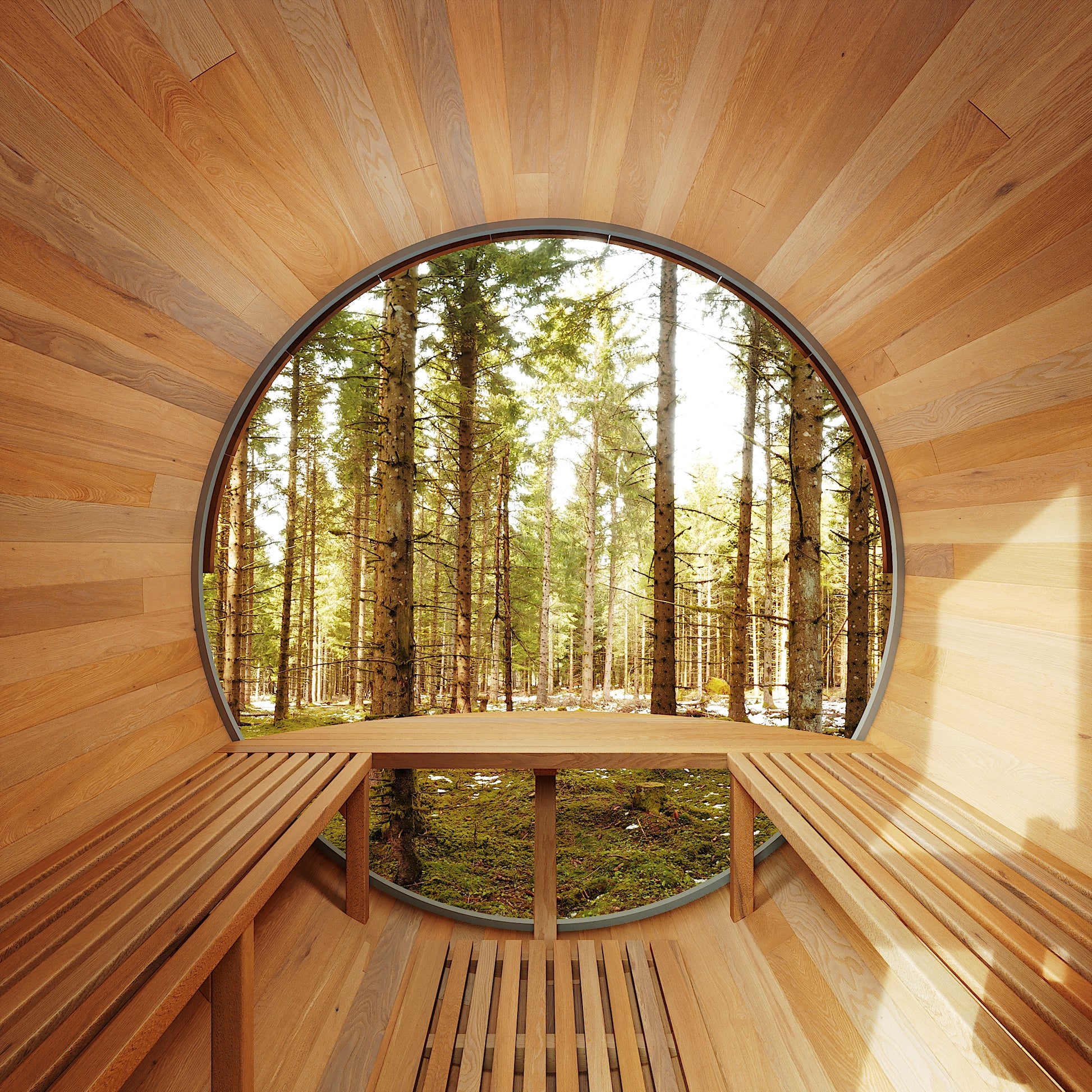Built-In Flooring & Premium Benches: Includes ergonomic benches with an arched seat design for optimal comfort during sauna sessions.
